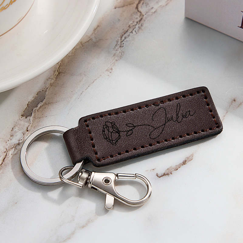 Custom Keychain Engraved Keychain Personalized Leather Keychain Name Flower Keyring Birthday Gift Love Gift