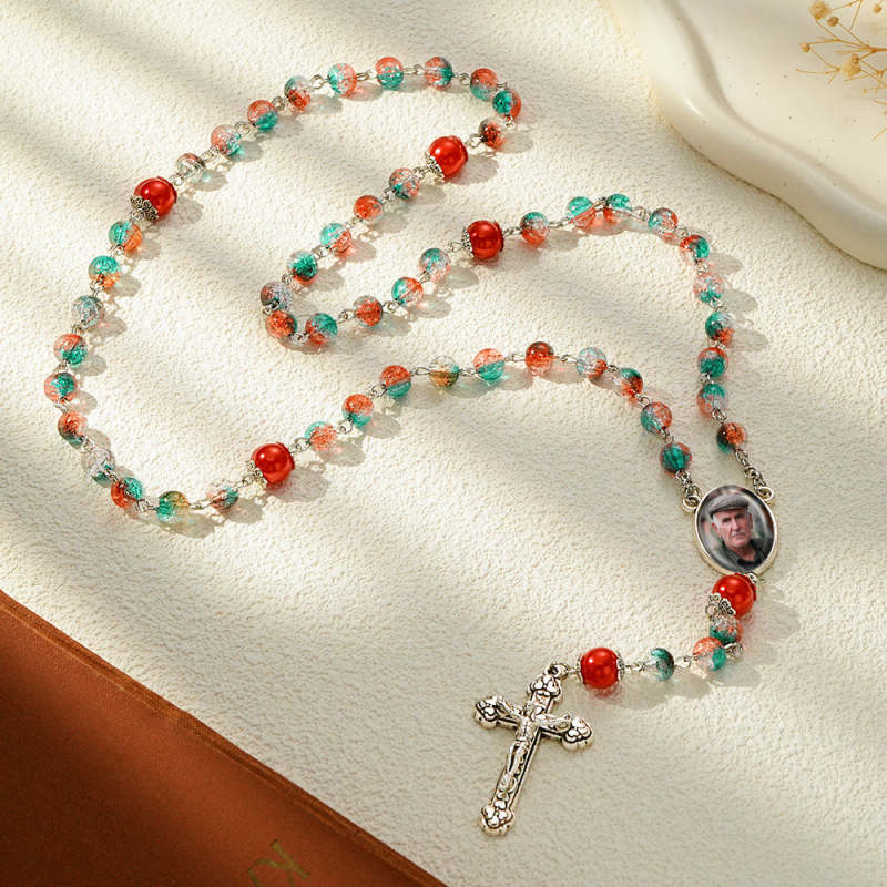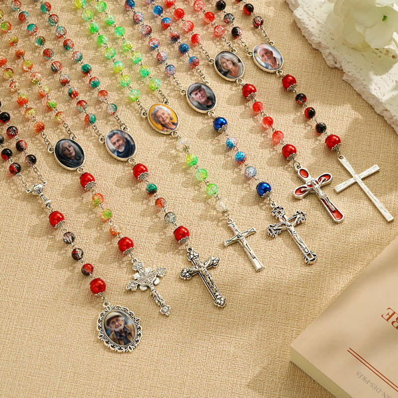 Custom Rosary Beads Cross Necklace Sentimental Memorial Gift Prayer Personalized Acrylic Explosion Beads Long Style Necklace with Photo