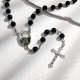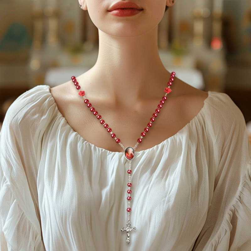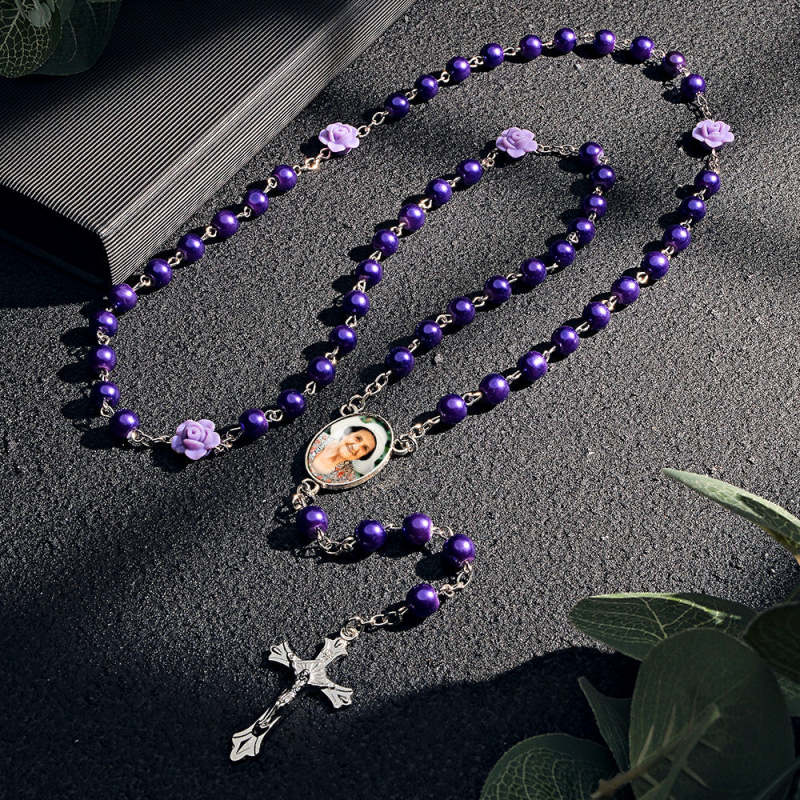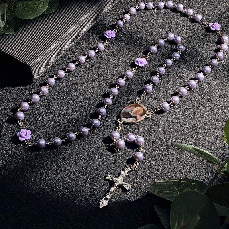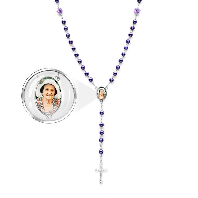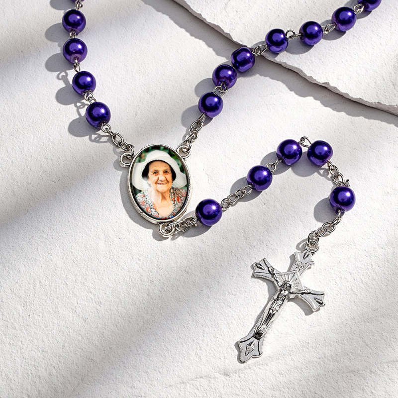 Custom Rosary Beads Cross Necklace Sentimental Memorial Gifts for Catholics Personalized Glass Imitation Pearls Necklace with Photo