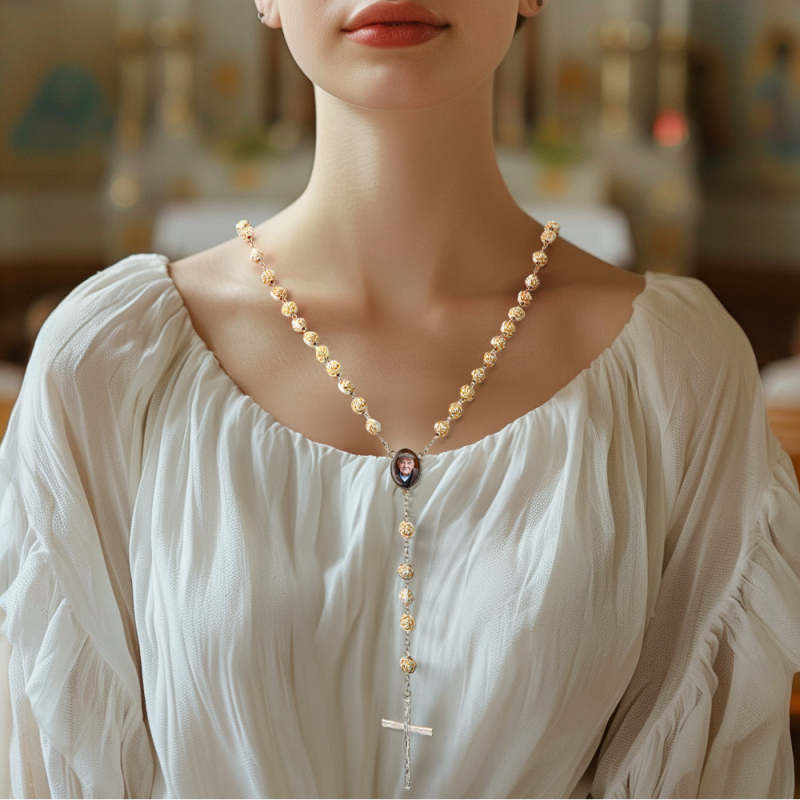 Custom Rosary Beads Cross Necklace Sentimental Memorial Gifts for Catholics Personalized Golden Rose Beads Necklace with Photo
