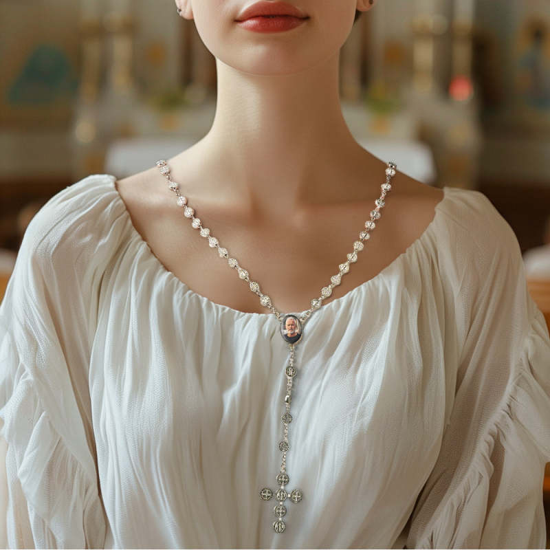 Sentimental Memorial Gifts for Catholics Custom Rosary Beads Cross Necklace Personalized Vintage Alloy Beads Necklace with Photo
