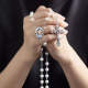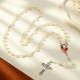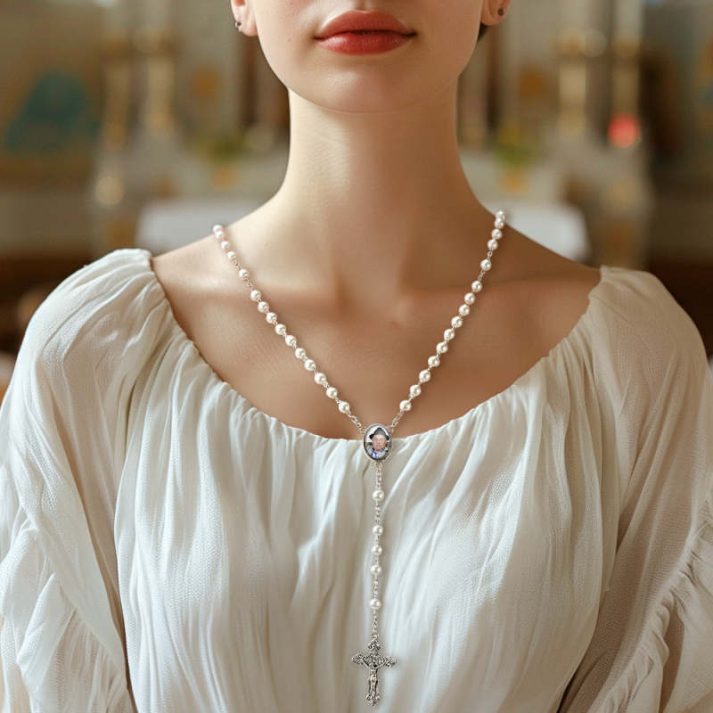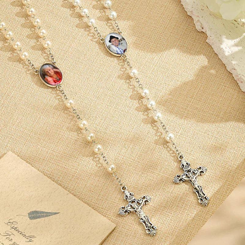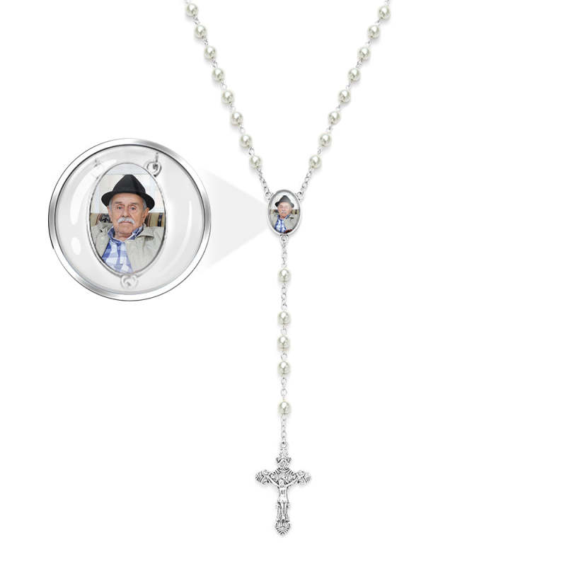 Custom Rosary Beads Cross Necklace Sentimental Memorial Gifts for Catholics Personalized White Imitation Pearls Necklace with Photo