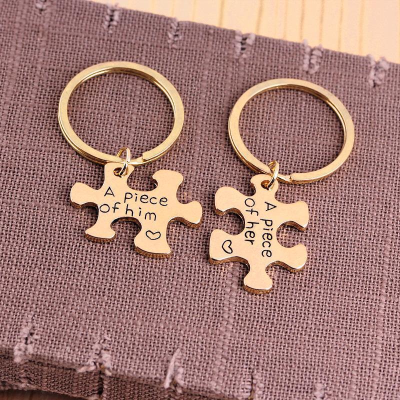 A Piece Of Him/Her Engraved Couple's Puzzle Keychain Gold Color