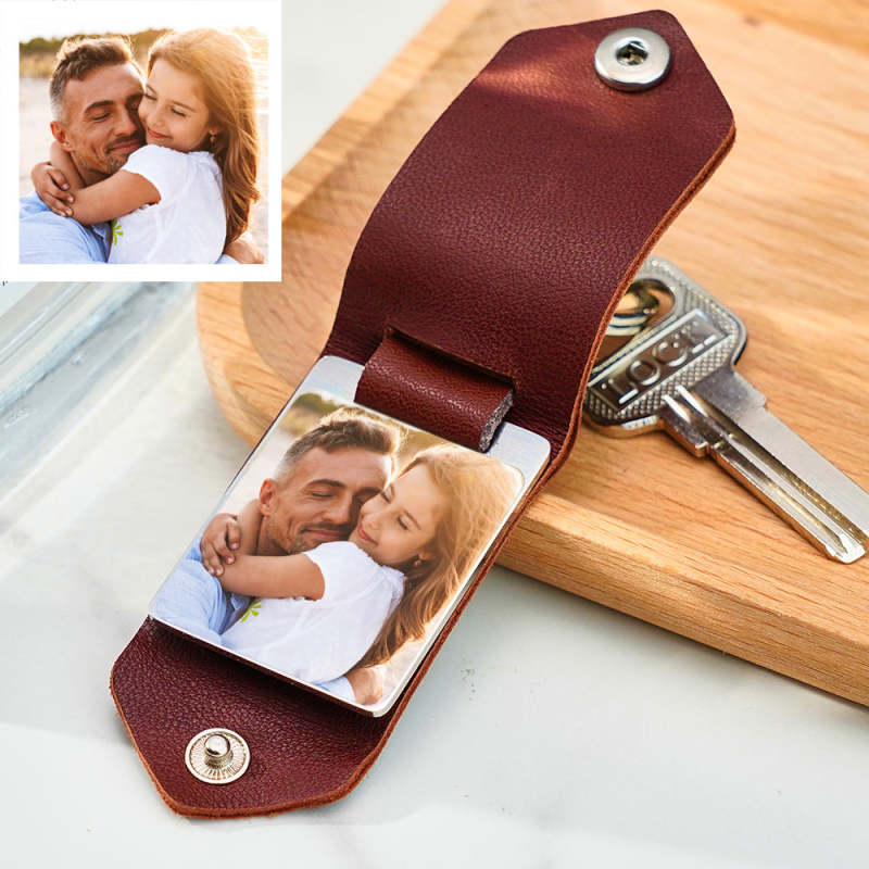 Leather Keychain Gift for Him Custom Engraved Keychain Photo Keyring Gift With Leather Case
