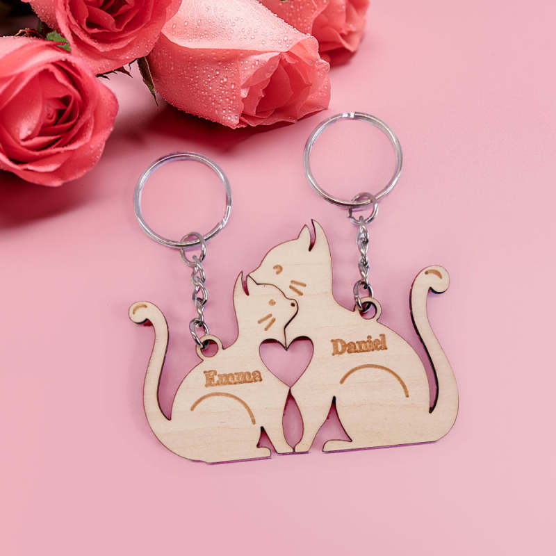 Personalized Wooden Couple Matching Keychain Custom Matching Hug Cats Keychain Valentine's Day Gifts for Lover